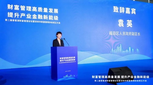 随后,深圳市福田区人民政府副区长袁英在致辞中表示,福田是深圳金融的集聚地,福田的金融生态完善,金融GDP占全市44%,拥有全市七成持牌金融机构,各类财富管理机构管理资产占全市六成,汇聚了大量优秀企业家、高净值人群,是国际财富管理建设的主阵地,是推动财富管理事业的最佳热土。她强调,市、区政府高度重视香蜜湖新金融中心规划建设和产业布局,深圳国际交流中心、金融文化中心、国际演艺中心等顶级配套设施坐落于此,香蜜湖新金融中心将成为具有全球影响力的财富管理中心、创新创业资本形成中心、科技金融中心。福田将与市财富管理协会并肩前行,汇聚全市的智慧和力量,开创深圳财富管理大事业的全新未来。