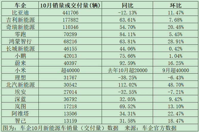 11月1日,新能源车企集中交出10月“成绩单”,交付量(销量)环比9月整体均实现增长。