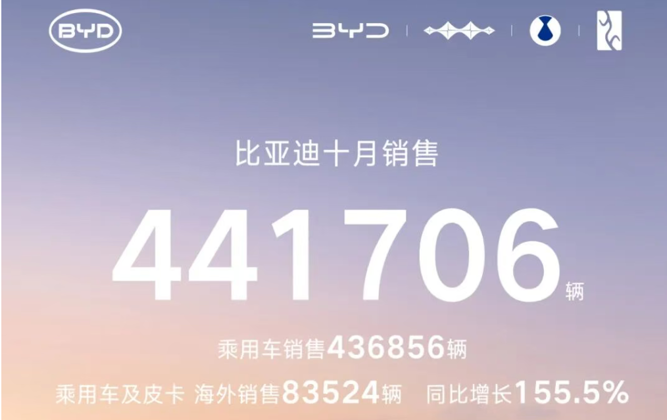 比亚迪11月1日宣布,其2025年10月的销量达44.17万辆,环比增长11.47%,创下2025年年内新高,并且2025年前10月的销量达370.19万辆。