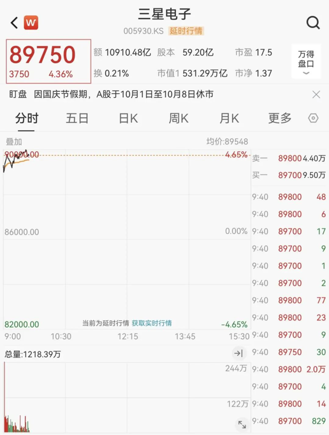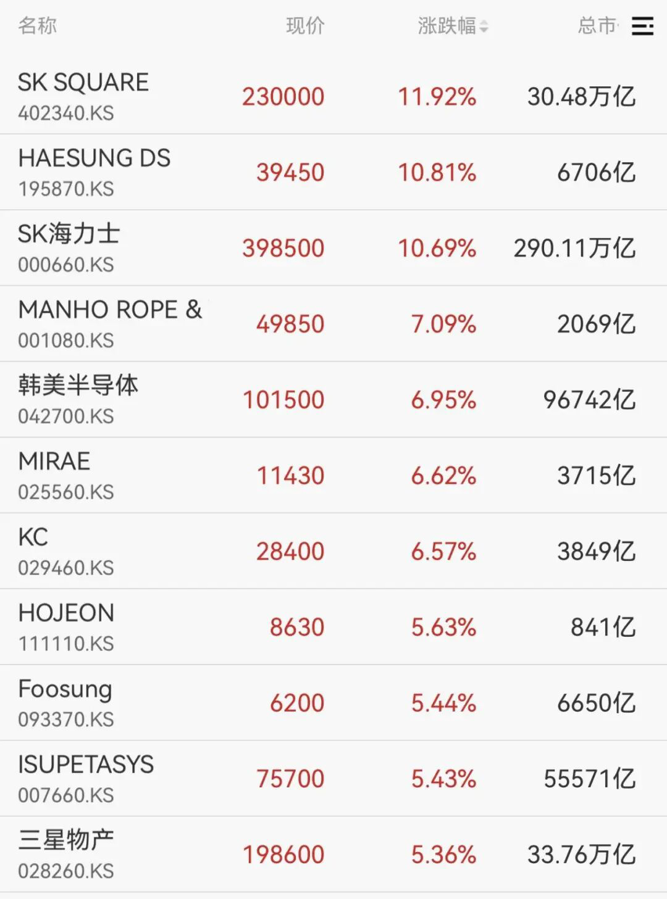 权重股方面,三星电子和SK海力士股价飙涨,三星股价涨超4%。