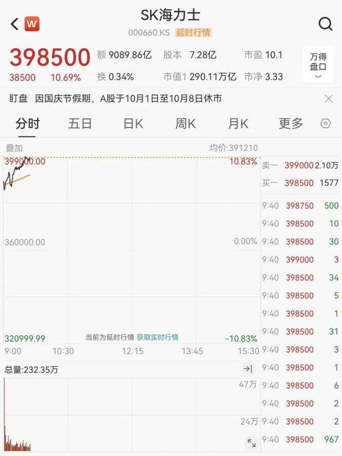 SK海力士涨超10%,为4月份以来的最大盘中涨幅,并创历史新高。