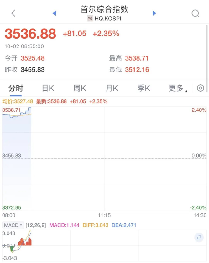 10月2日,韩国股市开盘大涨。