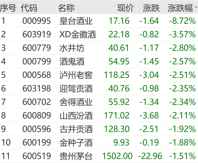 另外,上午白酒股整体走低,皇台酒业一度触及跌停,金徽酒、水井坊、酒鬼酒等跌幅居前。