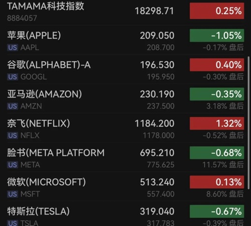 大型科技股多数收跌,谷歌涨0.40%,微软涨0.13%,亚马逊跌0.35%,特斯拉跌0.67%,脸书跌0.68%,苹果跌1.05%。