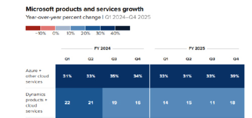 微软首次以美元披露了Azure业务规模。第四财季,Azure营收增长39%,远超分析师预期。2025财年,Azure及其他云服务的营收超过750亿美元,较上一财年增长34%。