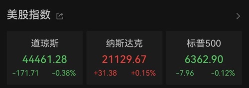 截至收盘,道琼斯工业指数跌0.38%,标普500指数跌0.12%,纳斯达克指数涨0.15%。