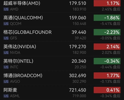 半导体股多数收涨,博通涨1.77%,超威半导体涨1.17%,台积电涨0.65%,阿斯麦涨0.41%,ARM跌0.09%,英特尔跌0.34%,高通跌1.86%。
