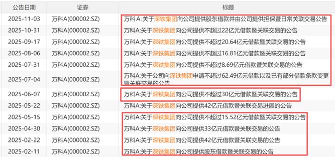 就在两天前的10月31日,万科又一次公告深铁集团向公司提供不超过22亿元借款,这已是今年以来万科至少第11次公告深铁集团向公司提供借款,合计金额达291.3亿元。