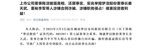针对董事陈洁的实名举报,11月25日,梦洁股份发布声明称,相关言论均为主观臆断或恶意捏造,公司已向公安机关报案,并启动民事诉讼程序。