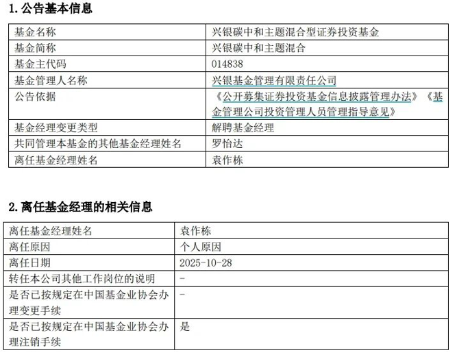 公告显示,袁作栋因“个人原因”离任,并未转任公司其他岗位且已按规定在中国基金业协会办理注销手续。这意味着,袁作栋已从兴银基金离职。
