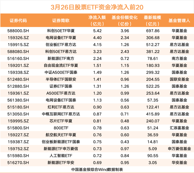 头部基金公司旗下ETF继续获得资金净流入。易方达基金方面,旗下ETF产品当日净流入3亿元。除前述创业板ETF易方达外,科创50ETF易方达净流入3.23亿元,A500ETF易方达净流入1.2亿元,红利ETF易方达净流入0.9亿元,中概互联网ETF易方达净流入0.87亿元。