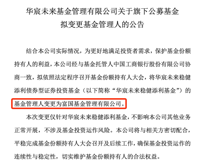 近日,华宸未来基金发布一则关于旗下公募基金拟变更基金管理人的公告。公告称,结合本公司实际情况,为更好地满足投资者需求,保护基金份额持有人的利益,本公司经与基金托管人工商银行协商一致,拟依照法定程序召开基金份额持有人大会,将华宸未来稳健添利基金的基金管理人变更为富国基金。