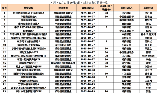 本周(10月27日至10月31日),全市场共有23只新基金(仅统计主代码)面市。其中,主动权益类基金和指数型基金成为发行主力。显然,在A股回暖的背景下,各家基金公司希望抢占先机,纷纷发力布局权益类基金产品。