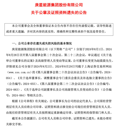值得注意的是,8月28日,庚星股份表示,截至目前,公司有关人员称公司印章、证照资料已遗失,未能办理有关移交手续。
