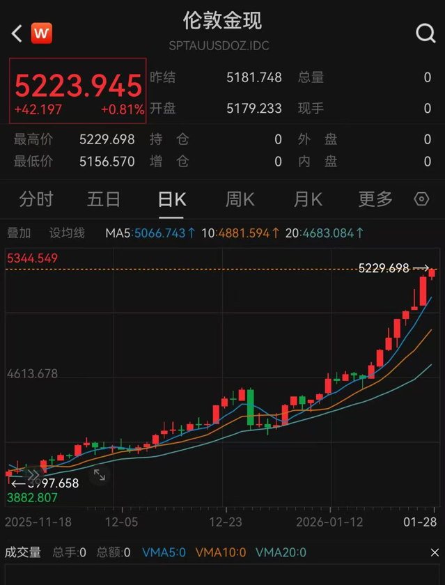 1月28日,国际金价持续暴涨,现货、期货双双突破美元/盎司关口,截至发稿,COMEX黄金报5210美元/盎司,上涨2.51%;伦敦金报5223.945美元/盎司,上涨0.81%。