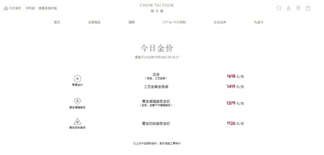 1月28日,多家金饰品牌足金报价突破1600元/克。其中,周大福报1618元/克,较1月27日的1578元/克,每克上调40元。