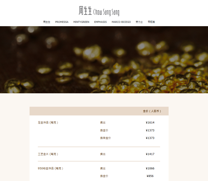周生生足金饰品报1614元/克,较1月27日1577元/克,上涨37元/克 。