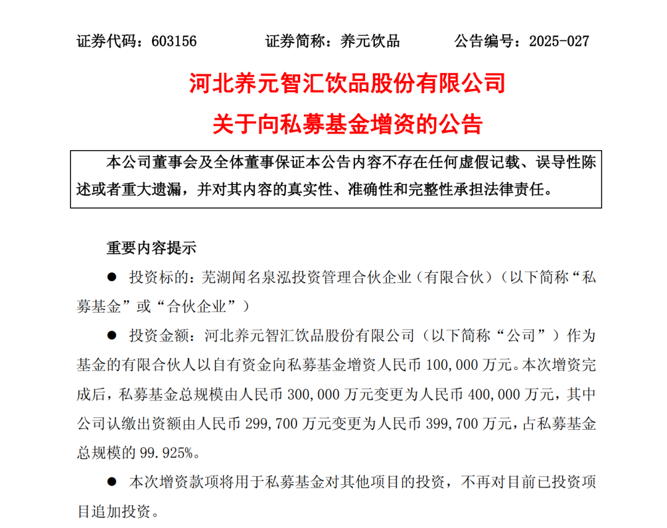 养元饮品在公告中特别指出,私募基金对外投资项目存在退出风险,且投资项目与公司主业不具有协同性,属于纯粹的财务性投资,存在市场波动风险。