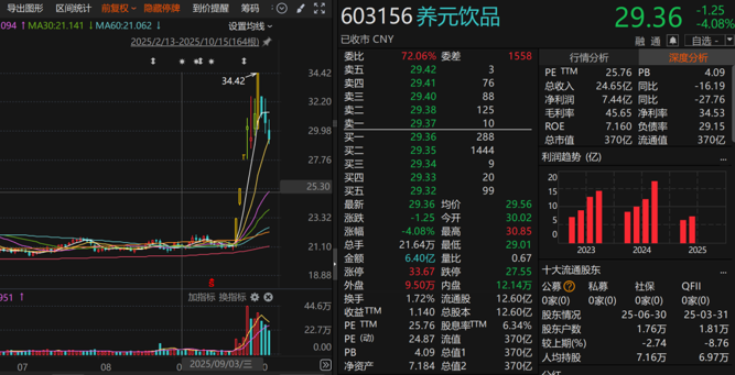 截至10月15日收盘,养元饮品报29.36元/股,总市值为370亿元。