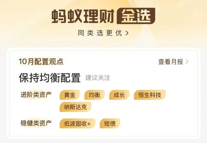 “蚂蚁理财金选”10月的配置观点显示,建议投资者在关注黄金、均衡、成长、科技等进阶资产的同时,搭配低波固收+、短债等稳健资产,以控制波动。蚂蚁基金数据亦显示,股债配置用户的盈利概率较持有单一资产的用户高出6%。