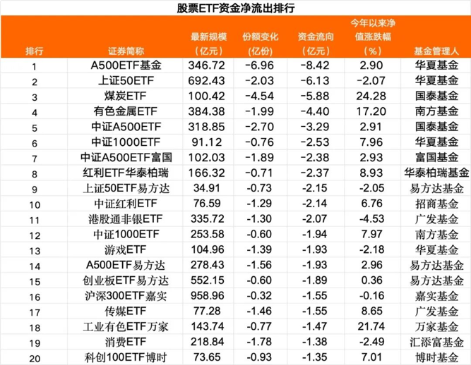 此外,股票ETF中,当日30只股票ETF净流出超过1亿元,A500、上证50、中证1000等宽基ETF,以及煤炭、有色金属等行业主题ETF是资金净流出较多的品种。