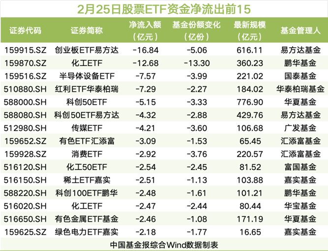 资金净流出方面,2月25日,创业板指数ETF资金净流出居前,达19.46亿元。