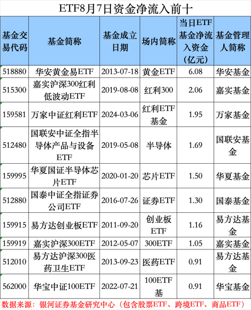另据华夏基金测算,8月7日,在细分品类中,行业ETF净流入3.60亿元,港股ETF净流入3.26亿元。