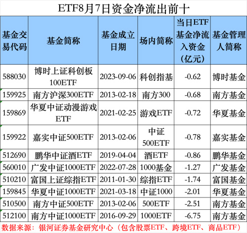 据银河证券基金研究中心数据统计,8月7日,全市场股票ETF(含跨境ETF)资金净流出1.53亿元,这也是股票ETF在此前连续17个交易日“狂买”1875亿元之后,“抄底”资金暂时歇息。