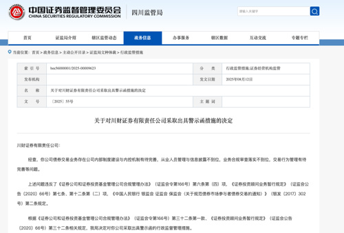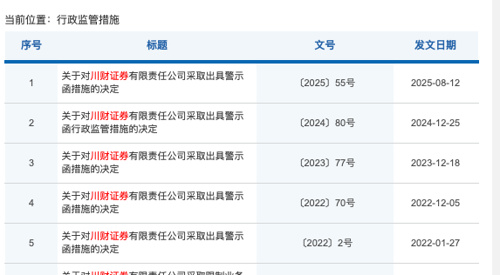 8月12日,四川证监局对川财证券采取出具警示函的措施