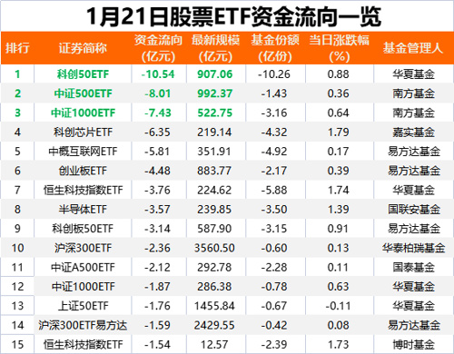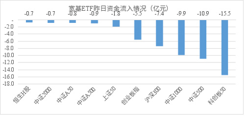 根据易方达基金统计,其中跟踪科创板指数的ETF净流出18.2亿元、跟踪中证500指数的ETF净流出11.1亿元、跟踪中证1000指数的ETF净流出9.9亿元、跟踪创业板指数和沪深300指数的ETF分别净流出7.8亿元。
