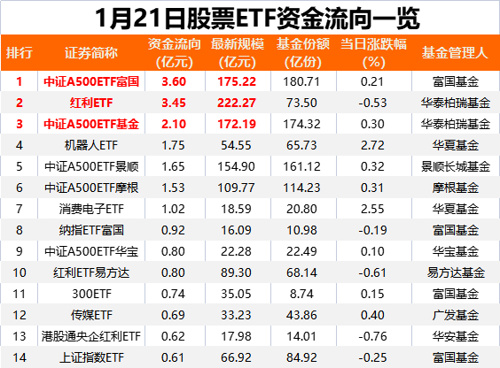 1月21日,沪深两市涨跌不一,当日股票ETF(含跨境ETF,下同)市场净流出资金超80亿元。其中,宽基ETF净流出金额居前,跟踪红利指数的ETF单日净流入金额居前。
