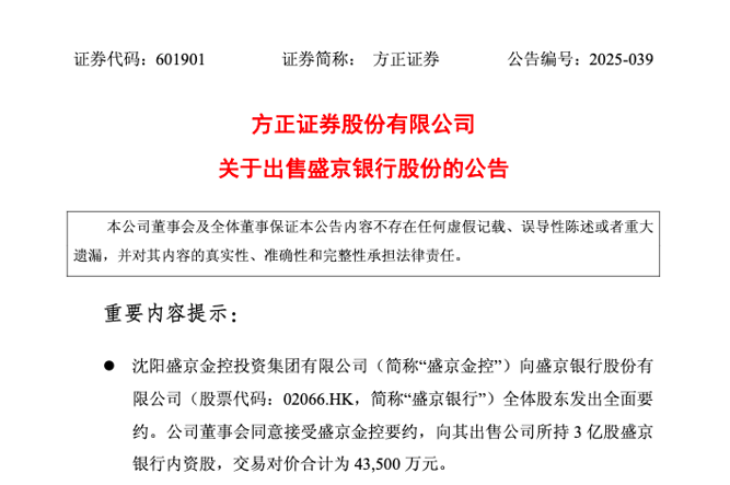 10月30日,方正证券发布公告称,沈阳盛京金控投资集团有限公司向盛京银行全体股东发出全面要约,方正证券董事会同意出售所持3亿股盛京银行内资股,交易对价合计为4.35亿元。