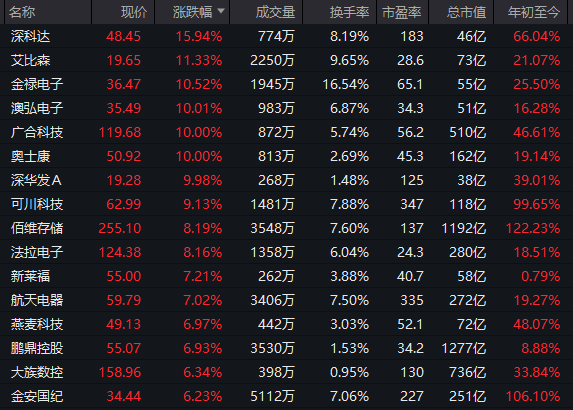 此外,电子元器件板块震荡拉升,深科达、艾比森、深华发A等涨幅居前。