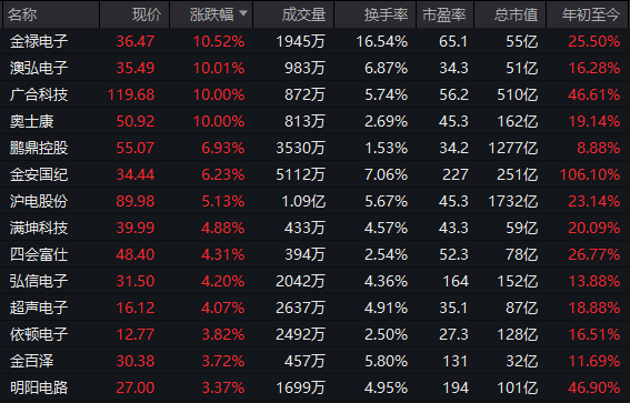A股市场电路板(PCB)概念股走强,金禄电子涨超10%,澳弘电子、广合科技、奥士康等纷纷涨停。