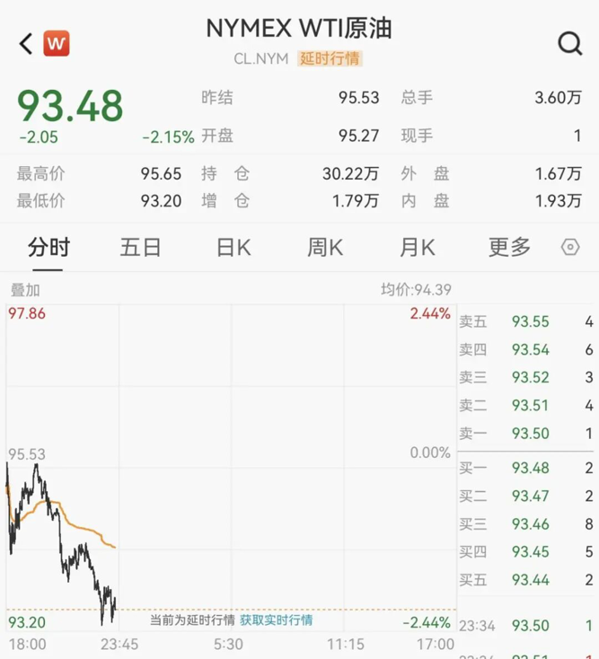 消息面上,国际原油期货价格再度下挫,WTI原油期货跌幅扩大至2%,最新报93.48美元/桶;布伦特原油向下跌破99美元/桶。