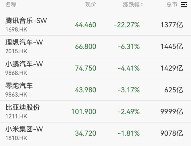 港股方面,恒生科技指数一度跌超1%。腾讯音乐大跌超22%,理想汽车跌超6%,、小鹏汽车、零跑汽车等跌超3%。