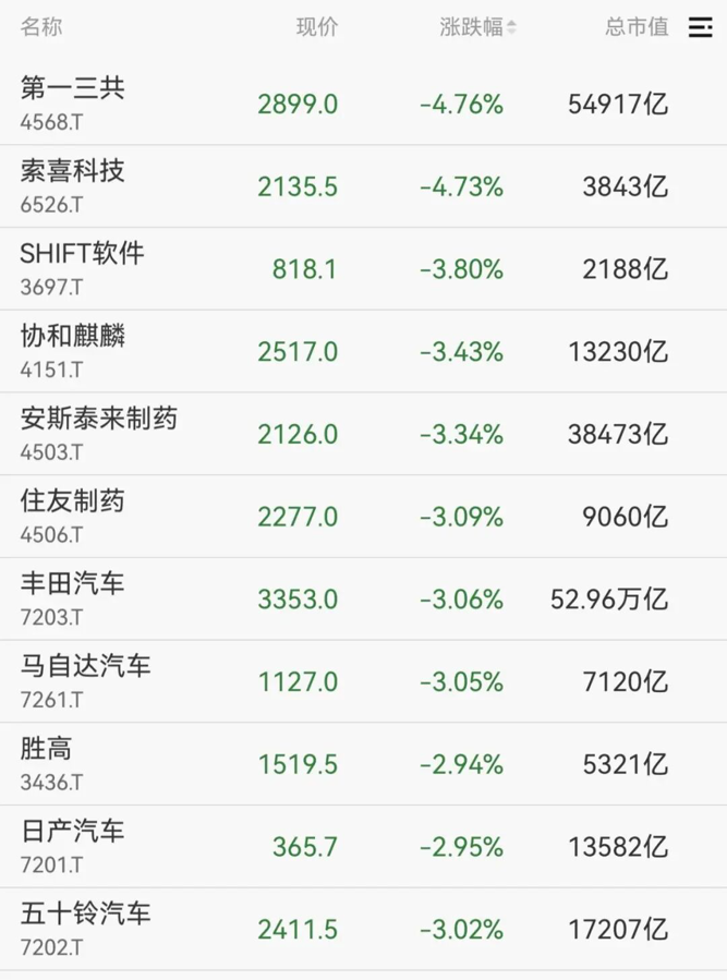 日元反弹引发了对企业盈利能力的担忧。个股方面,汽车和制药商领跌,丰田汽车、马自达汽车、住友制药等均跌超3%。