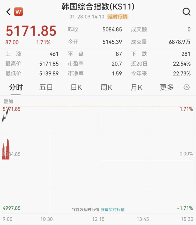 1月28日,日韩股市开盘涨跌不一,继昨日大涨后,韩国综合股价指数开盘继续走高,最新报5171.85点,上涨1.71%。