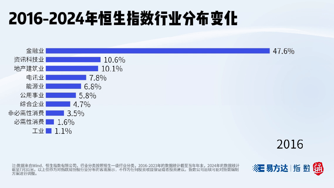 例如,资讯科技业从2016年约10%上升至目前近30%,非必需性消费从3%上升至10%;金融行业在2020年以前的占比均超四成,目前这一比例已下降至30%左右,地产建筑行业也从占比超10%下降至不到5%。