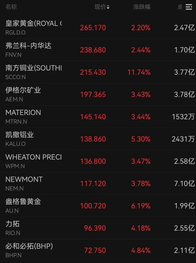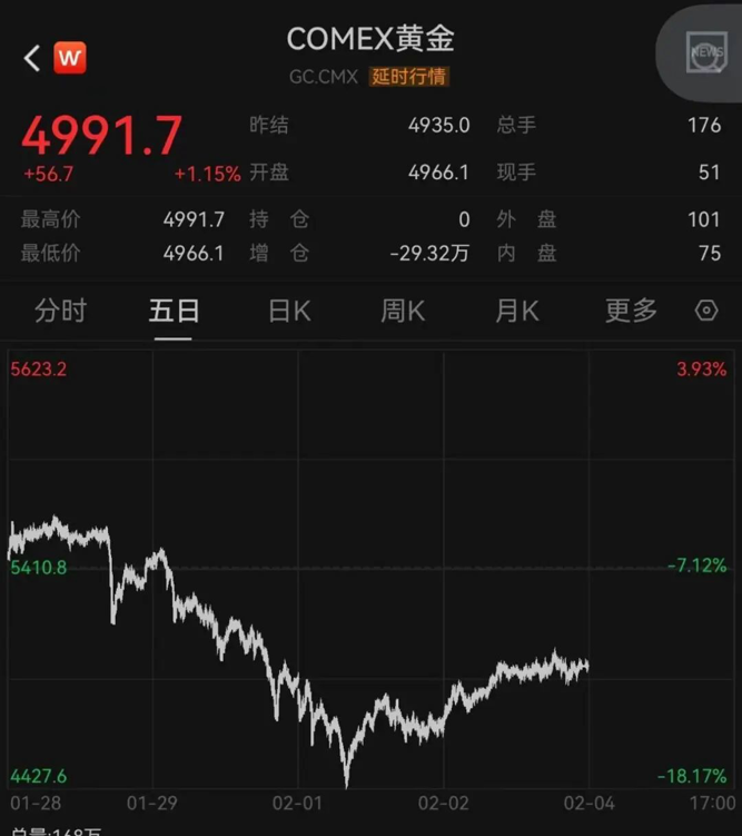 暴跌之后,国际金价反弹。COMEX黄金期货价格接近5000美元/盎司。美股有色板块走高,南方铜业涨超11%,盎格鲁黄金涨超6%,力拓、必和必拓涨超4%。