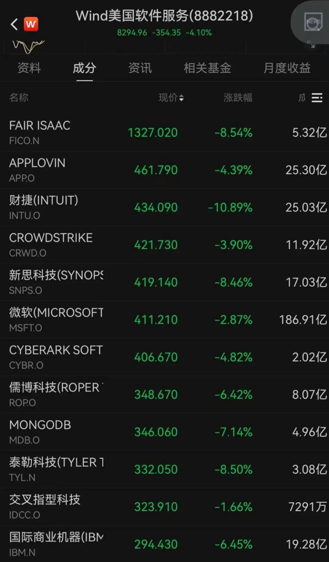 AI明星公司Anthropic发布的一款AI法律插件,引发软件公司暴跌,传导至一系列可能被AI取代的软件公司。汤森路透盘中跌幅达20.7%,收跌超15%。Wind美国软件服务指数下跌4.10%,成份股普跌。国际金价反弹