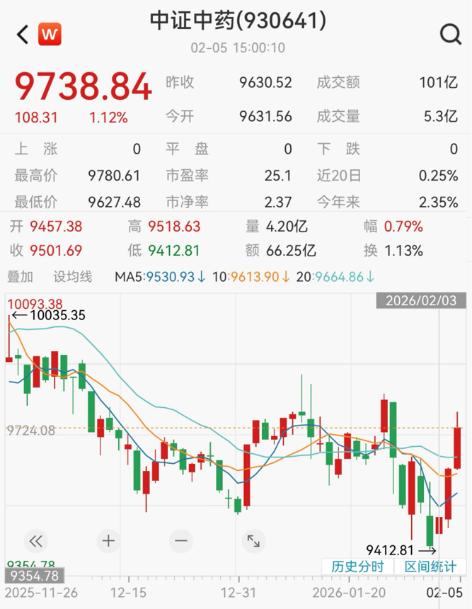 2月5日,中证中药指数上涨1.12%,已实现3连阳。