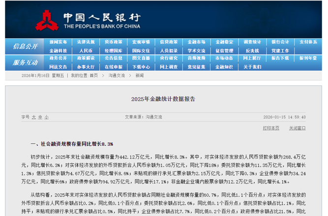 1月15日,中国人民银行发布2025年金融统计数据报告。报告显示,2025年末社会融资规模存量为442.12万亿元,同比增长8.3%。广义货币(M2)、狭义货币(M1)、本外币贷款余额同比分别增长8.5%、3.8%、6.2%。