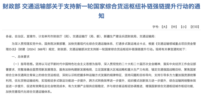 【导读】财政部、交通运输部发布《支持新一轮国家综合货运枢纽补链强链提升行动的通知》