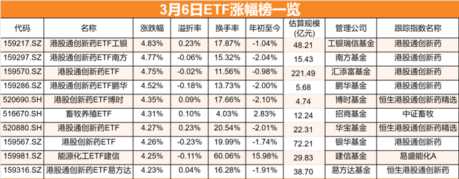 截至收盘,涨幅排名前十的ETF中,有8只是跟踪港股市场的创新药ETF,且涨幅全部超过4%,分别是港股通创新药ETF工银、港股通创新药ETF南方、汇添富旗下的港股通创新药ETF、港股通创新药ETF鹏华、港股创新药ETF博时、华宝港股通创新药ETF、银华港股创新药ETF、港股通创新药ETF易方达等。