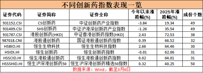 从指数表现上看,据Wind数据统计,截至3月6日,恒生生物科技指数表现最好,今年以来涨幅为2.66%,而从去年全年表现上看,中证港股创新药指数表现最好,全年涨幅超过72%。