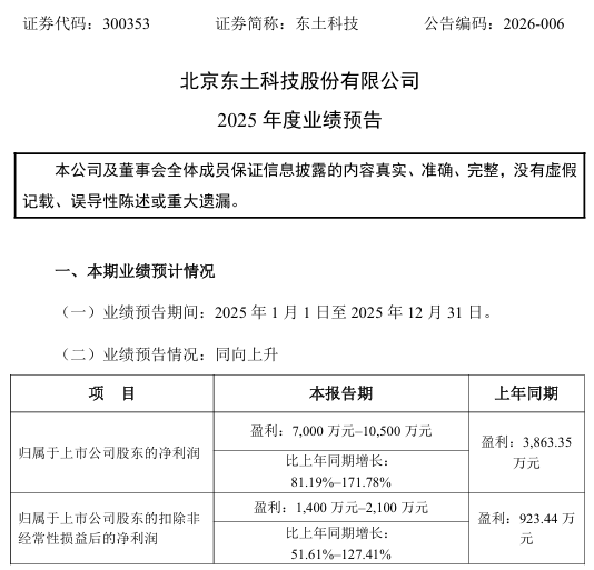 东土科技此前发布业绩预告称,预计公司2025年的归母净利润为7000万元至1.05亿元,同比增长81.19%至171.78%;扣非后净利润为1400万元至2100万元,同比增长51.61%至127.41%。