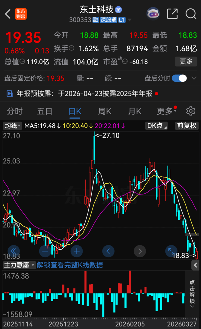 3月27日收盘,东土科技股价报19.35元/股,总市值为119亿元。