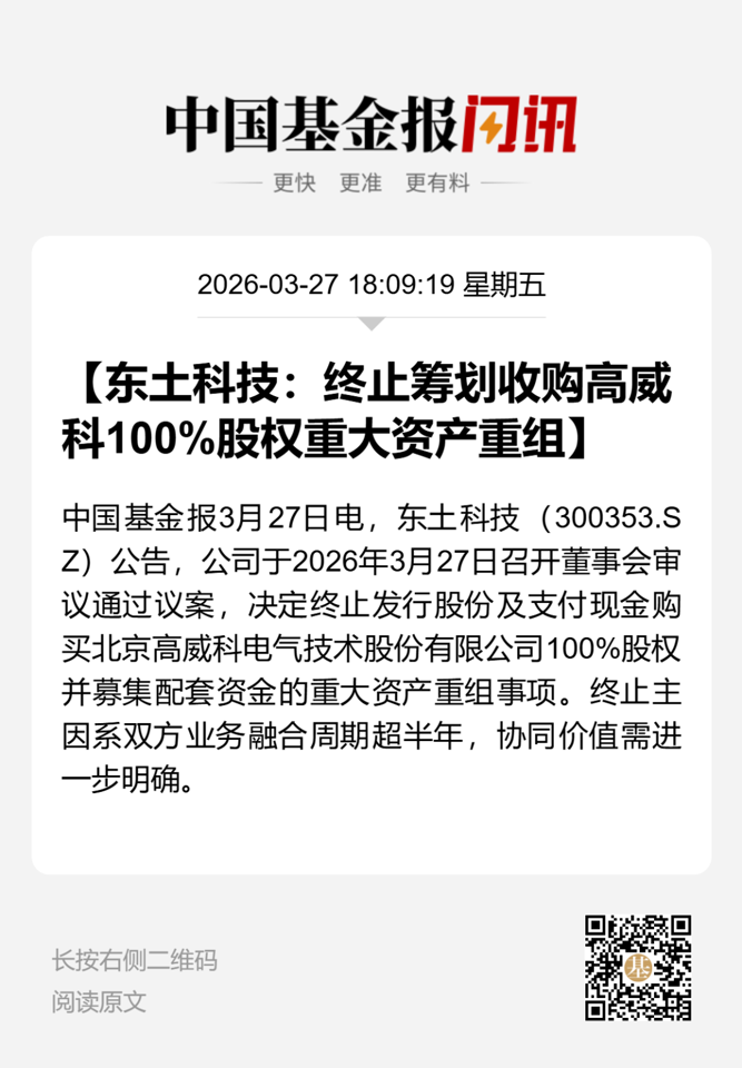 东土科技公告称,公司决定终止筹划重大资产重组,主要是交易涉及多个领域的产品和解决方案融合,融合周期需要半年以上。