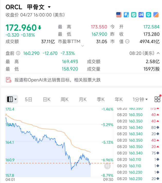 这则消息,重新引发市场对科技公司财报季前AI支出规模的担忧。软银集团、甲骨文等OpenAI合作伙伴股价应声下跌。